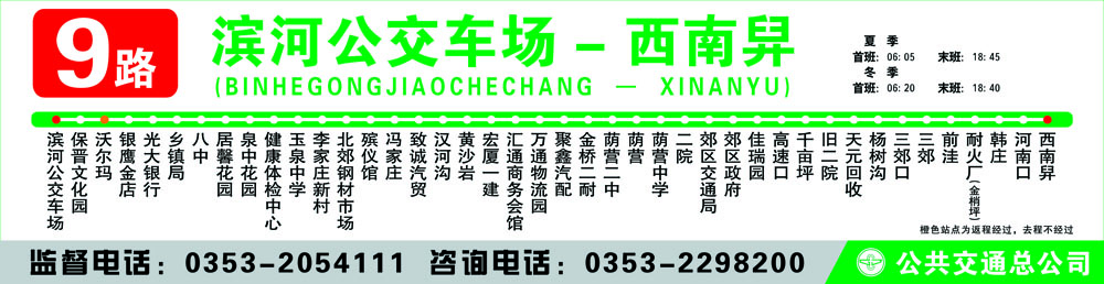濱河公交車場(chǎng) - 保晉文化園 - 銀鷹金店 – 光大銀行 - 鄉(xiāng)鎮(zhèn)局 - 八中 - 居馨花園 – 泉 中花園 - 健康體檢中心 - 玉泉中學(xué) - 李家莊新村 - 北郊鋼材市場(chǎng) – 殯儀館 - 馮家莊 – 致誠汽貿(mào) - 漢河溝 - 黃沙巖 - 匯通商務(wù)會(huì)館 - 萬通物流園 - 聚鑫汽配 - 金橋二耐 - 蔭營二中 - 蔭營 - 蔭營中學(xué) - 二院 - 郊區(qū)交通運(yùn)輸局 - 郊區(qū)政府 - 佳瑞園 - 高速口 - 千畝坪 - 舊二院 - 天元回 收 - 楊樹溝 - 三郊口 - 新世紀(jì) - 三郊 - 前洼 - 耐火廠(金梢坪)- 韓莊 - 河南口 - 西南 舁 - 五里莊 - 雨下溝